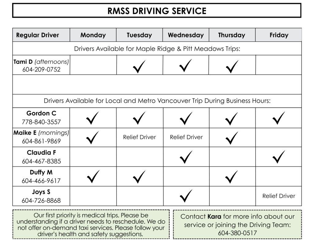 Call a driver from the schedule below. If no Regular or Relief Driver is available, try drivers listed for other days. Answer a few questions and book your ride.